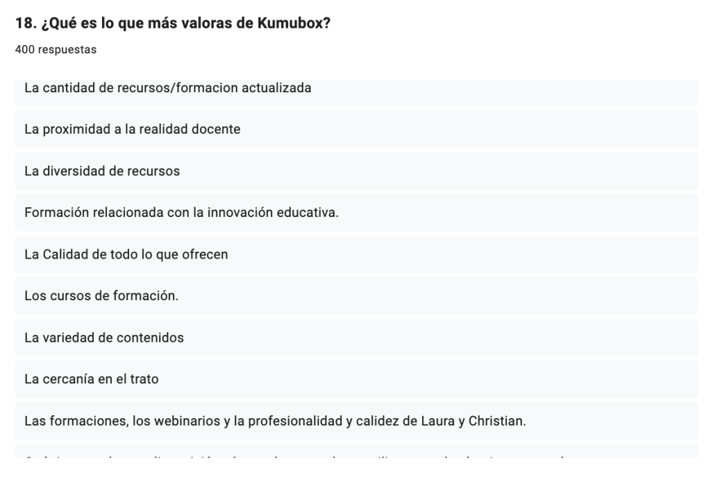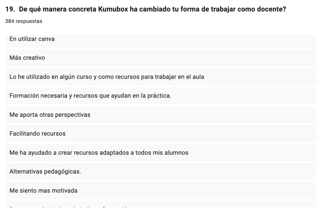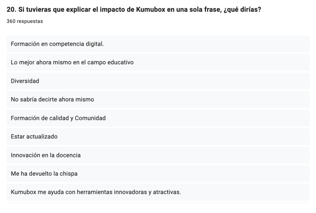 Asimismo, las personas encuestadas destacan la sensación de acompañamiento, la reducción de la soledad profesional y el aumento de la motivación y el compromiso con la docencia como efectos relevantes de formar parte de la comunidad Kumubox.