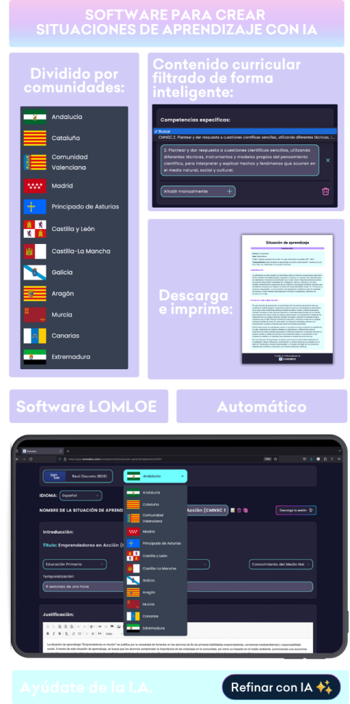 Olvídate de pasar horas frente al ordenador. Nuestro creador de situaciones de aprendizaje con inteligencia artificial te permite generar propuestas completas en menos de 30 minutos. Pero no es una IA que lo haga por ti, sino contigo: primero te pedirá que describas tu aula, el tipo de alumnado y los recursos que tienes, y a partir de ahí construirá una situación realista y adaptada a tu contexto. Todo el proceso sigue paso a paso la estructura de la LOMLOE y los decretos autonómicos, para que tu planificación cumpla con la ley y refleje tu forma de enseñar. Al terminar, podrás descargar el documento completo en PDF listo para presentar o adaptar.
