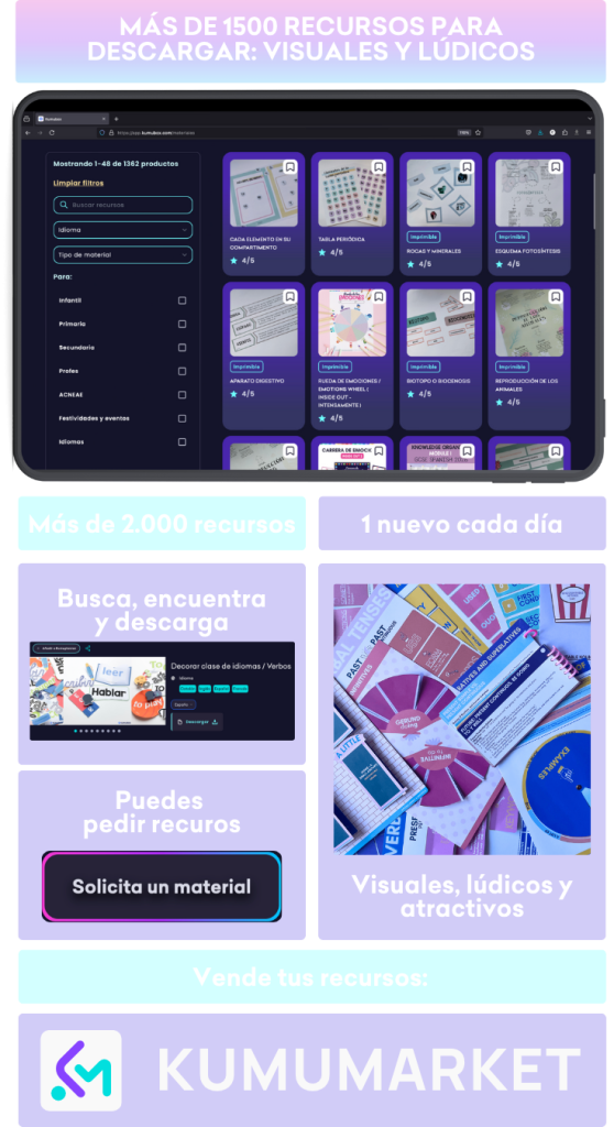 Aquí encontrarás todo lo que no cabe en el libro de texto: materiales visuales, lúdicos y flexibles para trabajar contenidos de manera significativa. Cada día añadimos nuevos recursos creados por docentes, para docentes, pensados para ahorrar tiempo y hacer tus clases más dinámicas. También puedes compartirlos con las familias para reforzar aprendizajes en casa, de forma divertida y práctica. En KumuBox, aprender y jugar van siempre de la mano.